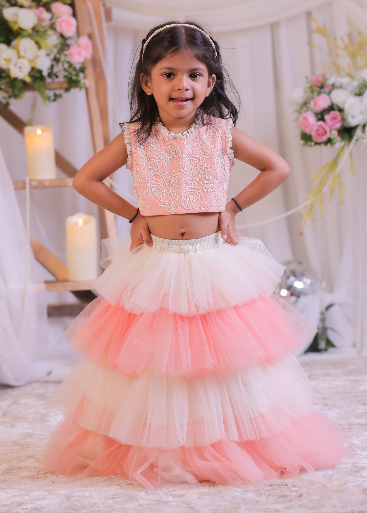 • Peach And White Cotton Top With Net Frill Ghagra Set