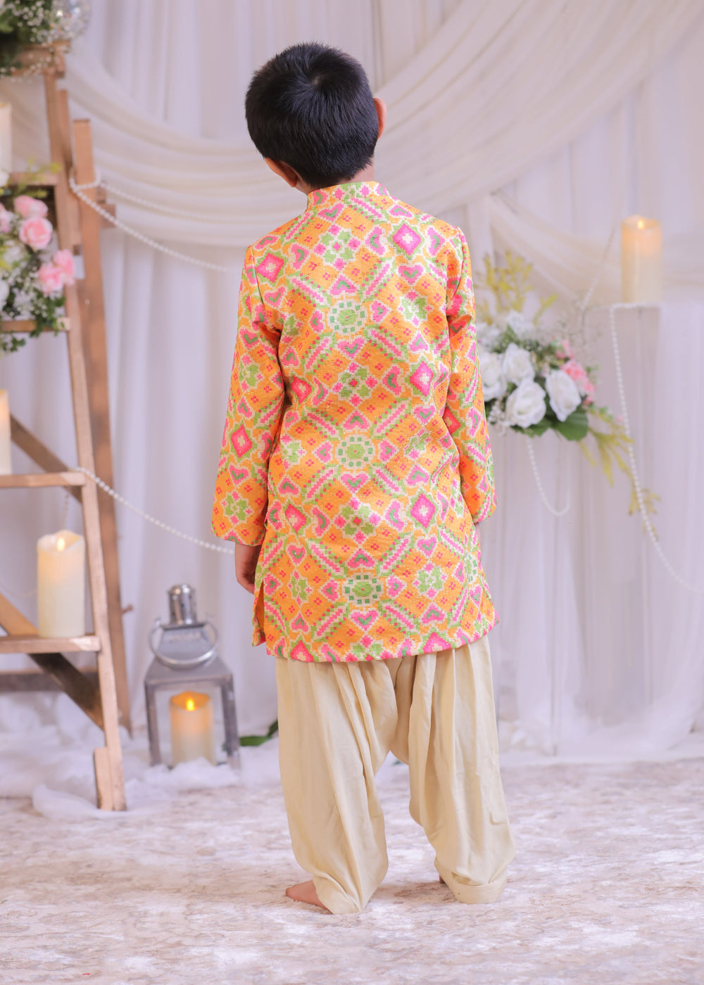- Orange Ikkat Embroidered Weaved Silk Kurta With Patiala Set