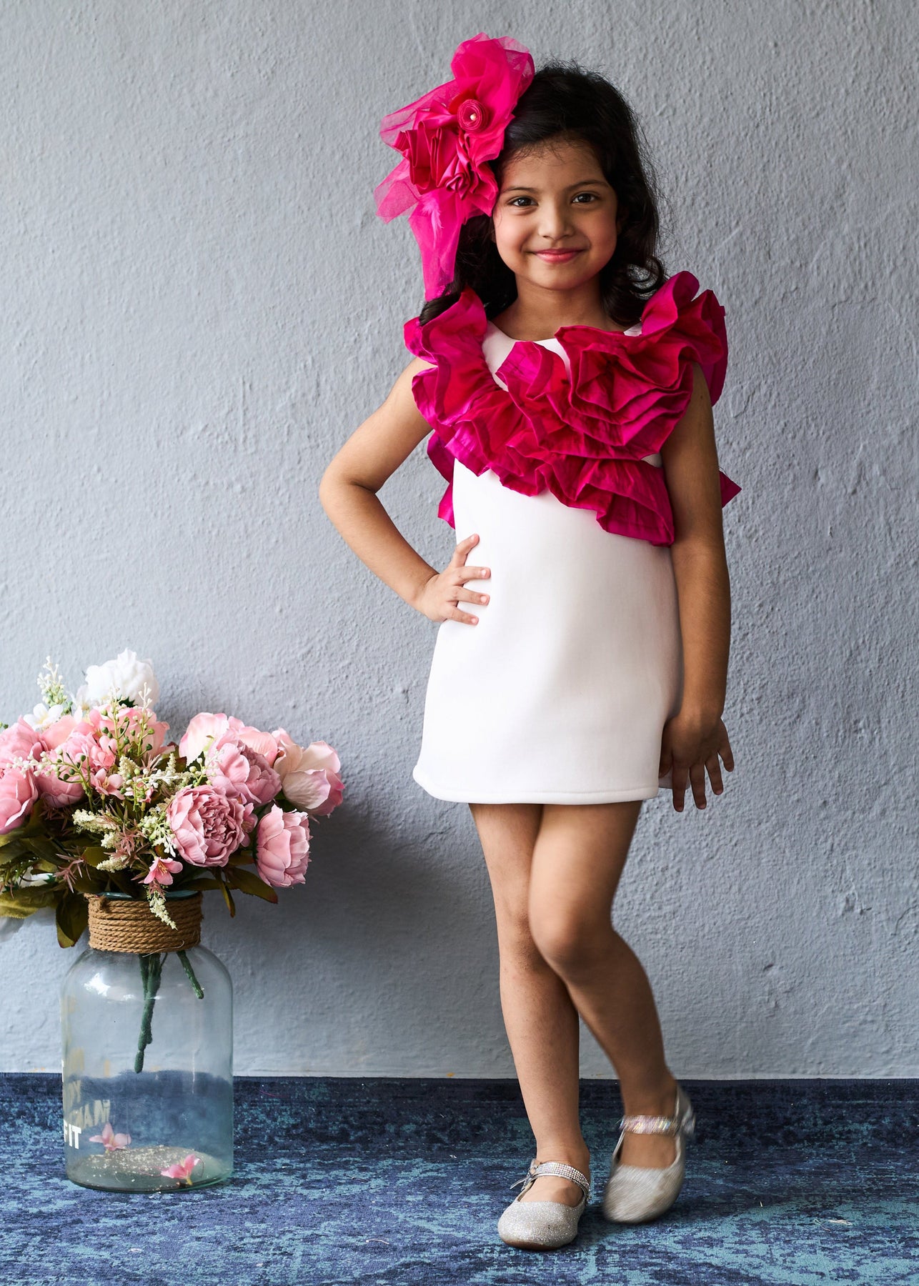 Elegant white A-line dress featuring bold, vibrant pink floral ruffles around the neckline for a striking look. Sleeveless design ensures comfort and freedom of movement for little ones. Paired with a matching oversized floral headband for a coordinated, fashionable appearance. Ideal for parties, family gatherings, and special events.